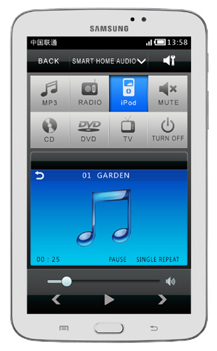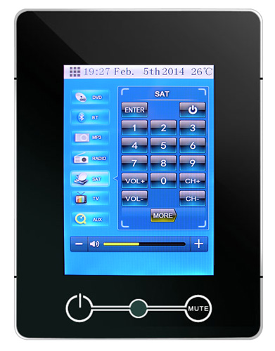 - k centrále jsou dodávány 4 nástěnné ovládače s 3,5" barevným TFT LCD dotykovým displejem. Na těch uživatel volí hudební kanál (DVD, tuner, Mp3, Bluetooth, TV, SAT, AUX), nastavuje hlasitost, basy, výšky, vybírá skladby, Mp3 soubory, posunuje, vrací zpět, ladí a ukládá stanice tuneru atd. Samotný ovladač se tak tváří jako plnohodnotný lokální přehrávač.