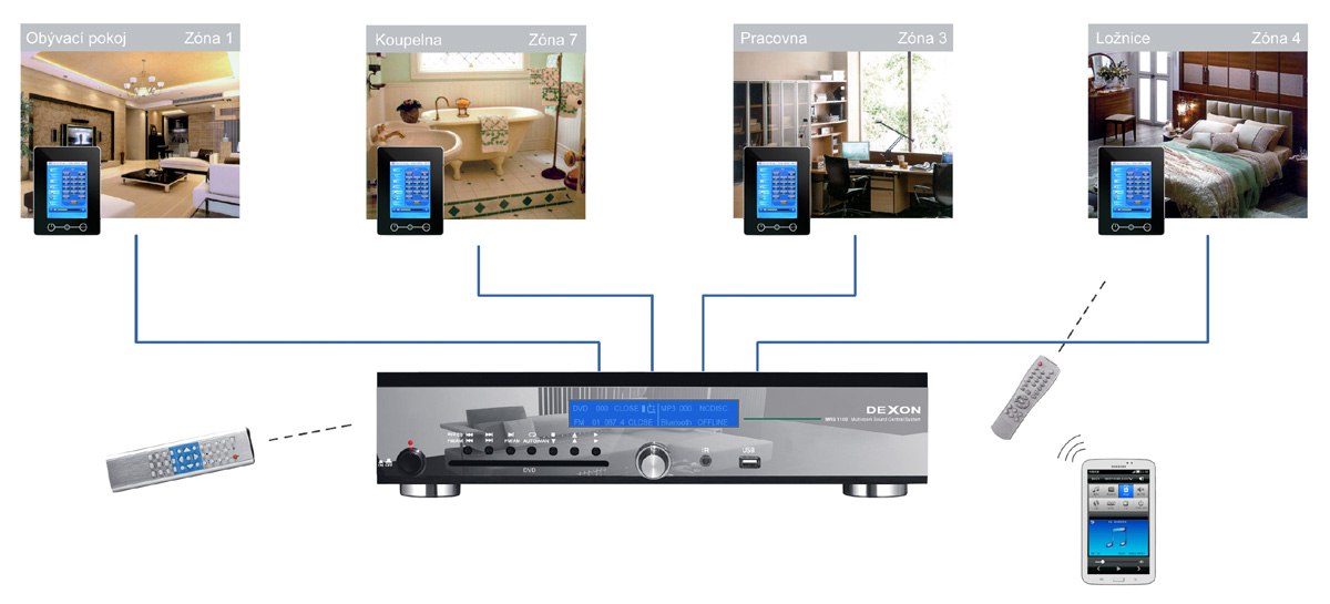 MRS 1160 je kompletním řešením ozvučení typu multiroom pro rodinné domy, byty, kanceláře, wellness centra a penziony. Jedná se o plnohodnotné HiFi řešení pro 4 stereofonní zóny s 7 hudební kanály. Oproti konkurenci navíc se zdroji signálu – DVD, Mp3 z USB, AM/FM tunerem a Bluetooth přijímačem. Taktéž lze vybírat z vnějších zdrojů TV / SAT / AUX, které můžeme ovládat pomocí povelů skrz IR LED vysílače. Centrálu ovládáme přes nástěnné LCD ovládače nebo aplikací v chytrém telefonu. 1 centrála tak řeší distribuci, zesílení i samotné přehrávání.