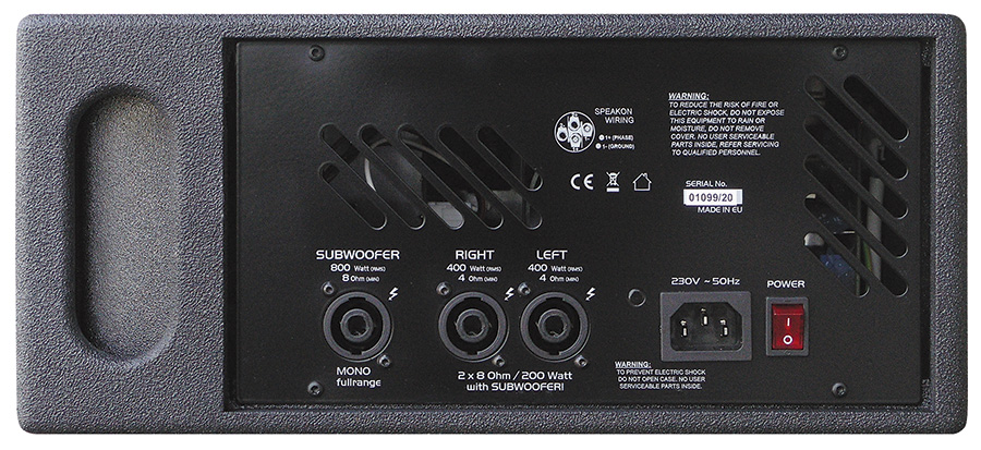 Brief description: 2×200 W / 8 Ω, 2× 400 W / 4 Ω + 1× 800 W / 8 Ω, 4 mono inputs, 3 stereo inputs, 2 way equalizer, effect module, Mp3 player from USB or SD, Bluetooth receiver, priority function Voice Over
