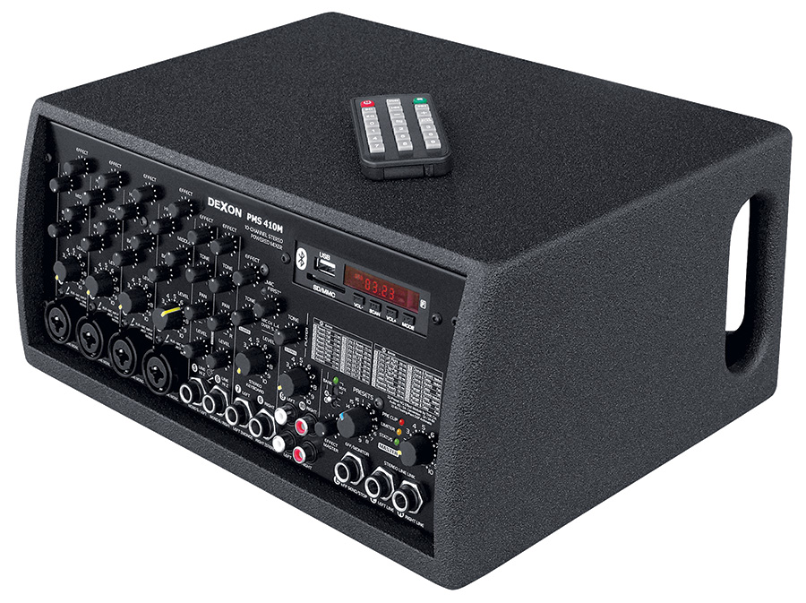 Výkonový mixážní pult PMS 410 je kombinací mixážního pultu, zesilovače, efektového modulu, přehrávače Mp3 a přijímače Bluetooth.